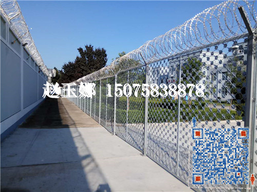 監獄鋼網墻用料:網高:1800-3000毫米,網寬2000-3000毫米。邊框:200x300mmx2.0mm,絲徑500mm,孔徑500x2000mm/700mmx1500mm,立柱:50*50*2.0毫米或60*60*2.5毫米方管,焊接成Y型, pvc浸塑處理或熱鍍鋅。Y型架上邊架蛇腹型刀刺:由熱鍍鋅鋼板或不銹鋼薄板沖壓出尖利的刀片狀,高張力鍍鋅鋼絲或者不銹鋼絲做芯線組合而成的阻盡器材。刀刺直徑采取50-60厘米,刀型整潔、刀片鋒利、排列均勻致密、連接堅固、防腐才能強,可能達到防攀越、防拆卸最高保險等級。