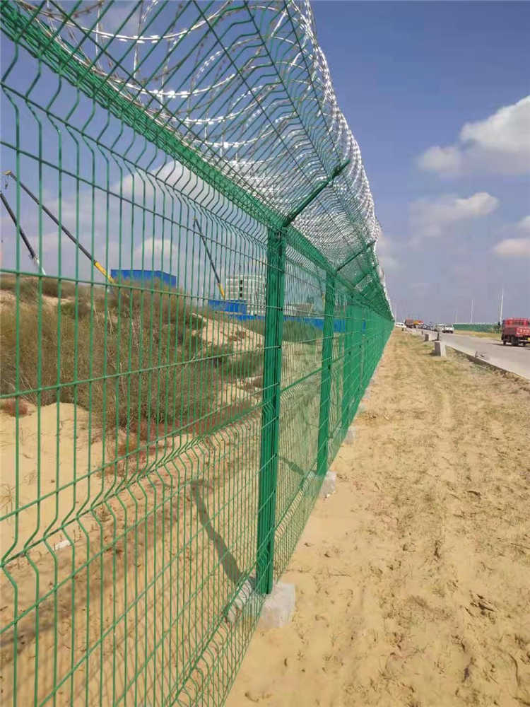 機場護欄網選用優質低碳鋼絲編制焊接而成,具有美觀、實用、方便運輸和安裝的特點。在機場護欄網的橫向加裝四道折彎加強筋,在整體成本增加不多的同時,使網面強度和美感顯著增加。